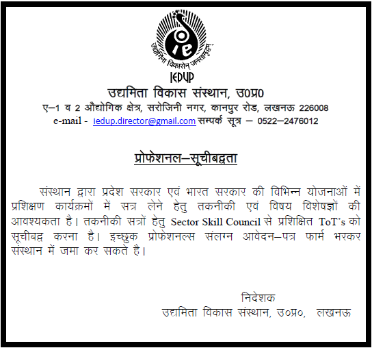 In its "Industrial Infrastructure and Investment Policy, 2012" Government of Uttar Pradesh has recognized IEDUP as a Centre of Excellence (CoE) for Entrepreneurship and Human Resource Development. In this role, Institute shall organize series of Skill Development and Capacity Building programmes for officials concerned with Industrial Development. Institute will seek professional resource support from other such National level CoEs.