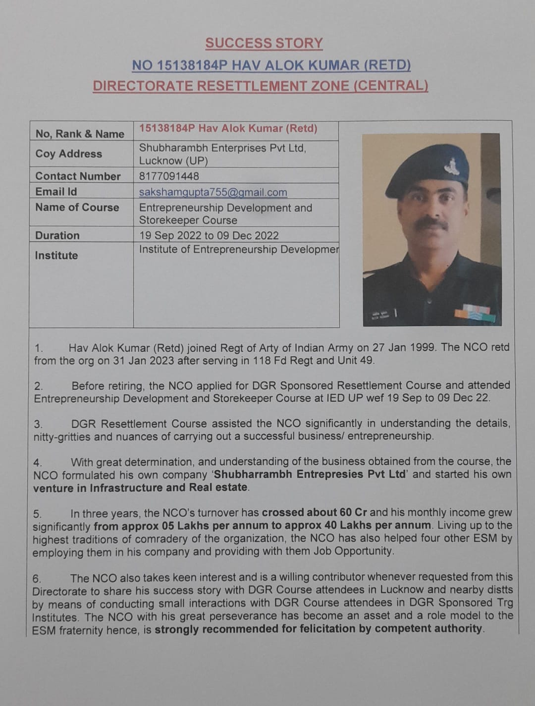 Facilitation of IEDUP, Lucknow PRC trained JCO Hav (Rtd.) Alok Gupta